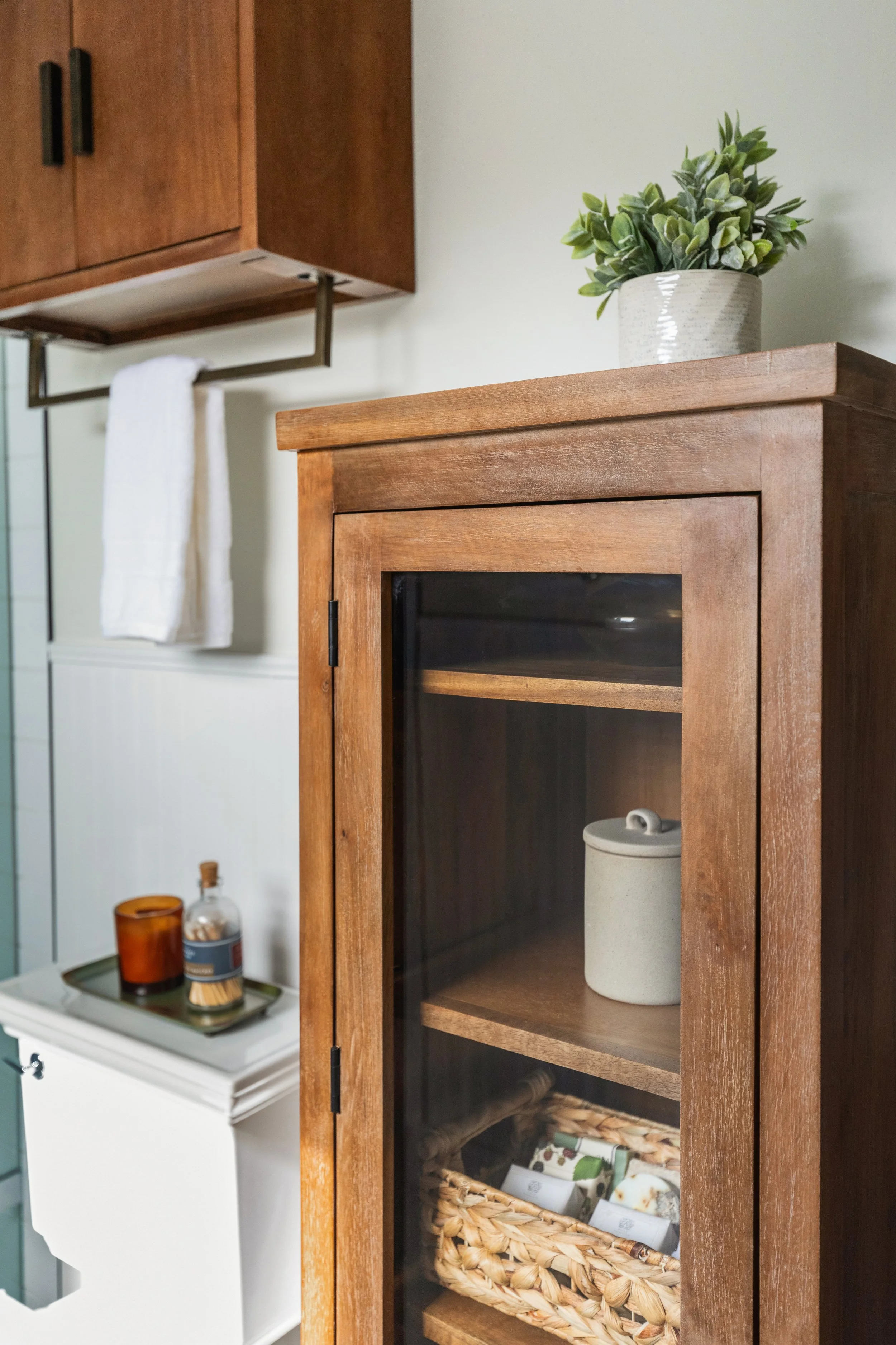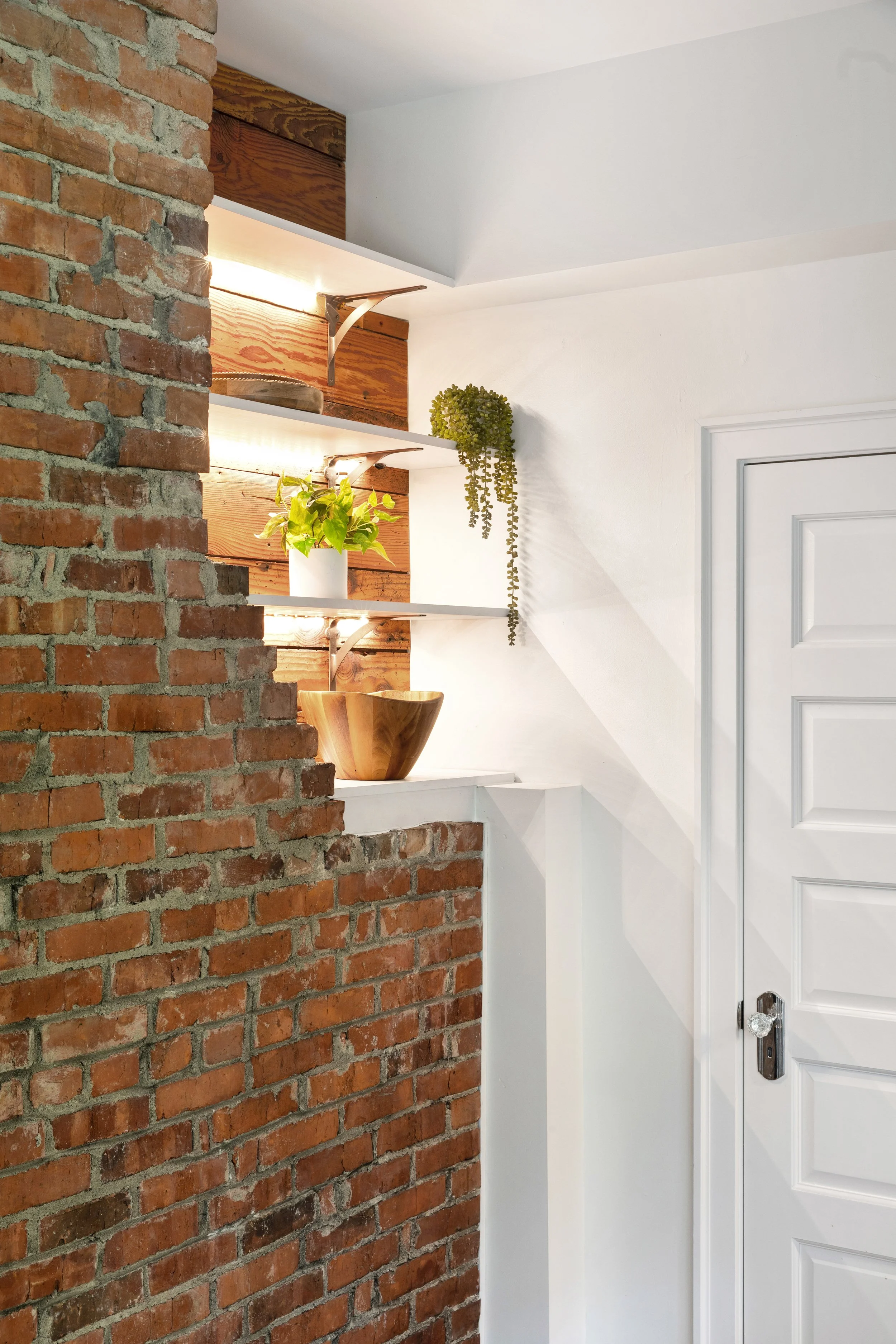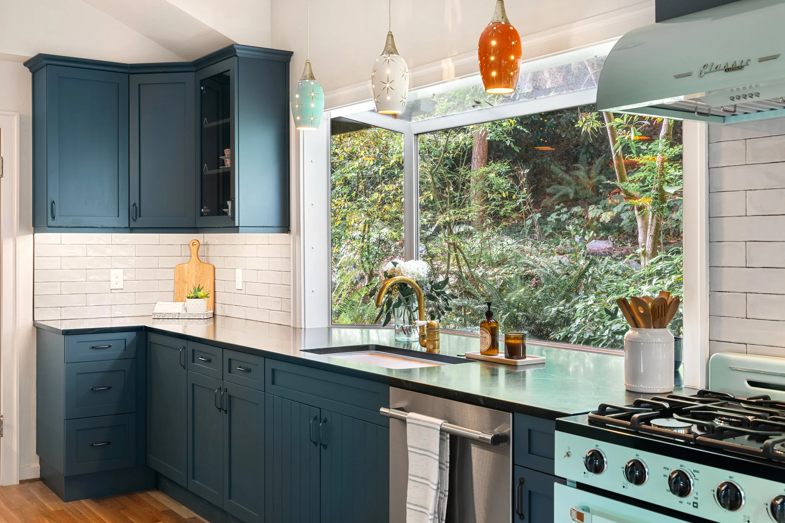 This 1905 Craftsman home renovation was one of our most cherished projects. We redesigned the kitchen and master bathroom while thoughtfully preserving original elements like the exposed fireplace brick and raw wood details. The goal was to honor the home’s historic charm by maintaining the Craftsman style. Nocturnal Teal cabinets paired with soapstone countertops bring a fresh yet timeless touch, perfectly blending modern functionality with classic design. The bathroom design emphasizes warmth and simplicity with rustic wood cabinetry and monochromatic finishes. This project beautifully celebrates the character and craftsmanship of a bygone era.