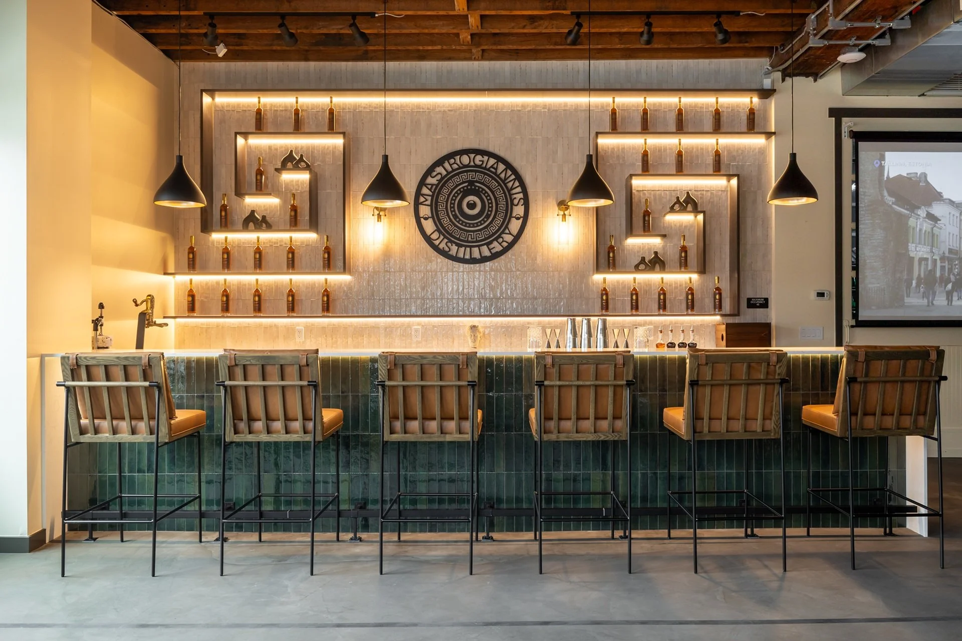 Joseph Design Group was hired to transform a 1,400 sq. ft. space into a sophisticated tasting room for a Greek distillery, seamlessly blending modern design with traditional craftsmanship. With a deep understanding of the brand’s heritage, we developed a concept that reflects its identity while creating an inviting and memorable guest experience.